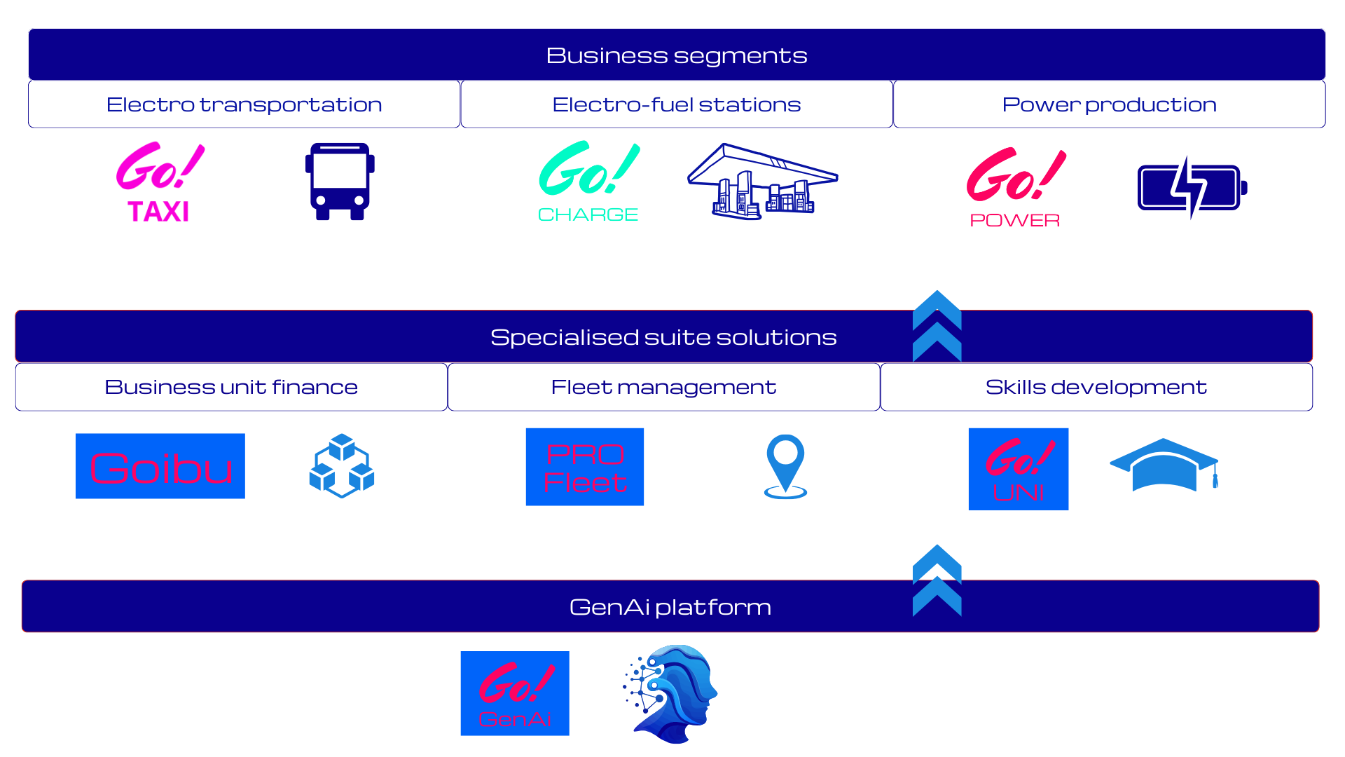The primary business segments are complemented by specialized suite solutions including Goibu, providing turnkey business unit finance, Profleet, a generative AI-powered fleet management system, and Go! UNI, an advanced skills development solution.